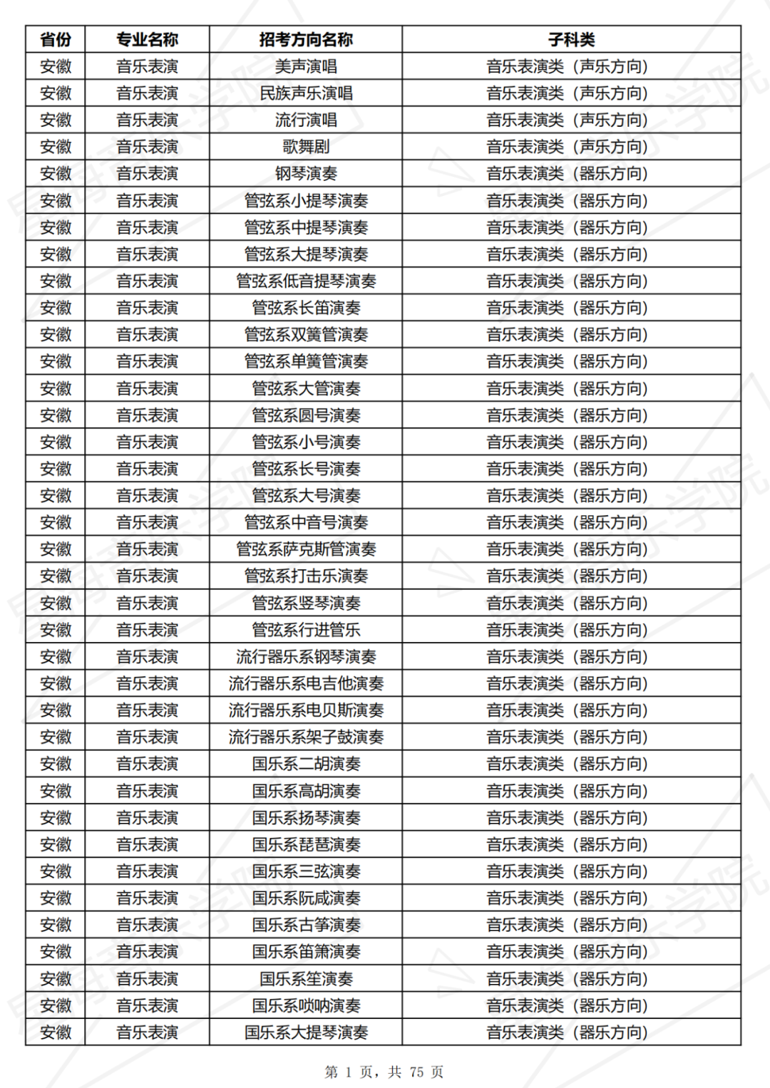 星海音乐学院发布2024年校考专业和各省统考子科类对照表